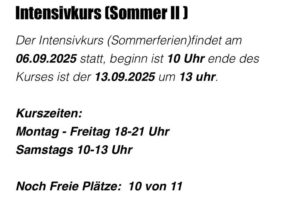 Der Intensivkurs (Herbst) Startet am 25.10.25, Beginn ist um 10 Uhr, Ende des Kurses ist der 03.11.2025 um 21 Uhr.